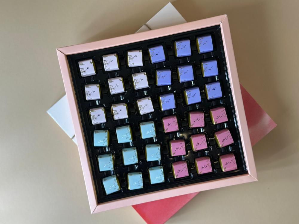 - مكعبات شوكلاتة بحشوات متنوعة فستق, كوكيز اند كريم, كراميل بندق وغيرها من الحشوات